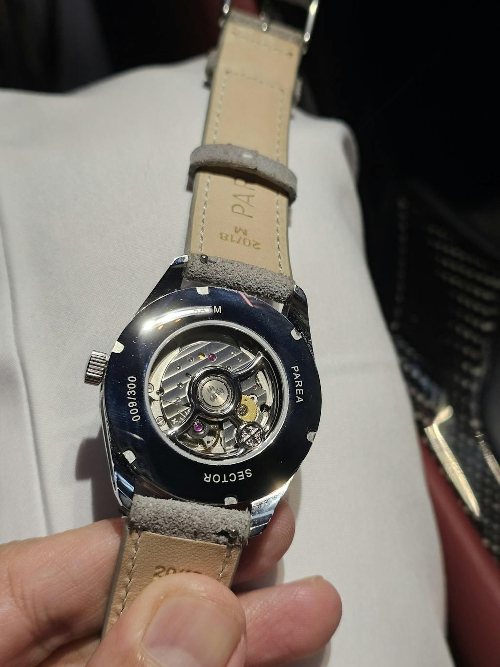 The dial on this watch is amazing, especially when it catches the light. So many different textures to it. The detailing on the case is impressive as well - mostly high-polish but with the sand-blasted sides for contrast. The quick-release straps make for super easy strap changes, and the ones that come with it are really nice. The red one is my favorite, but I think it also looks good on a crocodile strap that I had - it really brings out the neo-vintage vibe. With a 20mm lug width, plenty of options will fit! The lume looks great - putting it on the brand name is a nice touch, and something I've not seen before. The movement has been super accurate so far, and the sapphire display caseback shows it off beautifully. The only quibble I have is that the rotor is a bit noisy, but I've heard that's par for the course with Miyotas (this is my first). All in all, an amazing watch with great packaging and extras (watch roll, UV light, suede strap) to boot. Well done, Peter and Parea!